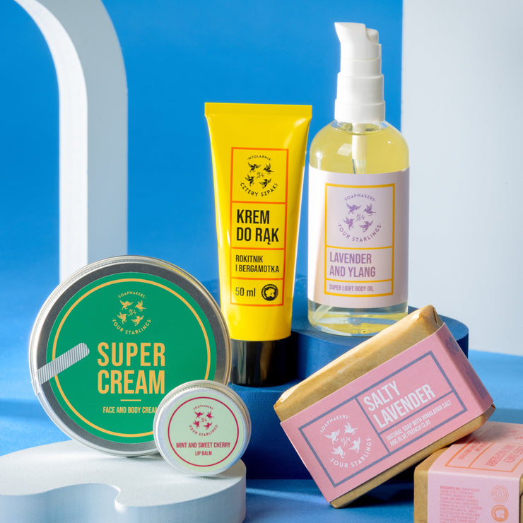 Each of our deodorants is vegan and very efficient : a 60ml jar lasts an average of four months with daily use. As always, we strive for less waste, which is why their packaging is made of glass. If you're unfamiliar with our Starling products, which care for your underarms and your comfort (both yours and those around you), and want to try them out to see if they really do what they say online and in town (that IT WORKS), but buying a full-size product makes you wonder, "What if it doesn't work for me?" – we have a suggestion. Our store offers a set of clever miniatures. We've named it Travelset, aka travel set , because it's quite charming and very fitting. It includes four mini products that allow for comprehensive care during any trip. There's a Super Cream , Flax and Chamomile soap , all purpose shampoo bar , and one of our current heroes: a 15ml Natural cream deodorant - citrus-herbal. It lasts about a month. That's enough time to see if it has the potential to become one of your beauty favorites under various conditions. Sounds like a good plan? We hope so, and we highly recommend it.